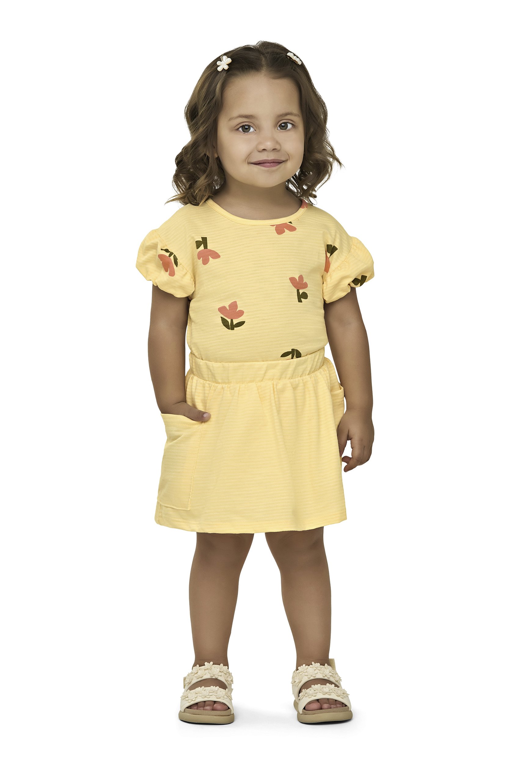 Conjunto Saia com Short Interno e Blusa com Estampa de Flores em Meia Malha